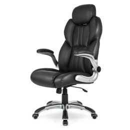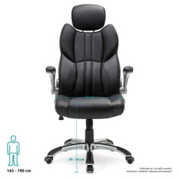 Kancelářské křeslo LEADER má odklopné područky, ergonomické tvarovaní a nosnost 140 kg. Je určeno všem, kteří potřebují pohodlné křeslo například k PC. Jeho hlavní předností je široký pohodlný sedák s tloušťkou 15 cm! Výplň sedáku je z pěny s vysokou hustotou a odolností proti prosezení. Vysoké opěradlo zad s ergonomickým tvarem poskytne kvalitní oporu v oblasti beder, krční páteře a hlavy. Bonusem je nastavitelná opěrka hlavy, výšku si upravíte přesně jako na autosedačce. Bohaté polstrovaní je zárukou pohodlného sezení, navíc se snadno přizpůsobí lidskému tělu. Potah křesla je z jemné a odolné umělé kůže černé barvy se snadnou údržbou. Prošití vypadá fantasticky! Ruce si můžete položit na čalouněné područky, které se dají odklopit směrem nahoru. Svojí velikostí je vhodné pro osoby s výškou do 190 cm. Křeslo má kvalitní houpací mechaniku s nastavením síly houpání. Síla houpání se reguluje v závislosti na váze uživatele velkým plastovým šroubem umístěným pod sedákem. Výška sezení se upravuje plynule páčkou. Je použitý kvalitní plynový píst s certifikátem BIFMA Class 3, stříbrný zesílený kříž má kolečka o průměru 50 mm pro všechny druhy podlah. Kancelářské křeslo má nosnost max. 140 kg, záruka 24 měsíců.
